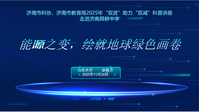 2025年11月24日,山东大学赵振卫教授受邀走进济南舜耕中学,为全校学子带来了一场“能源之变,绘就地球绿色画卷”的科普讲座。本次活动由邱丽娟副校长主持,杨国营校长亲临现场,参加活动。讲座内容紧扣国家科技发展战略与青少年科学素养培育,现场反响热烈。