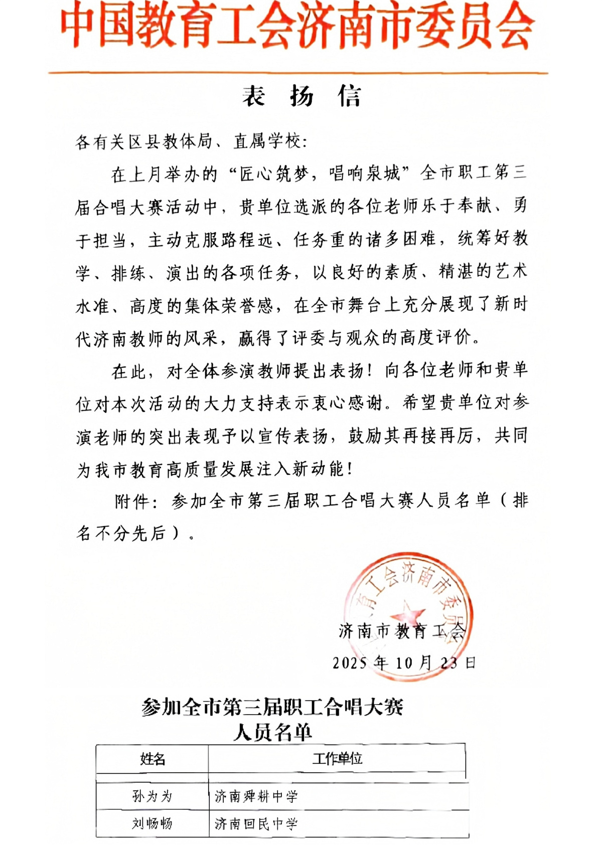 10月29日,我校收到中国教育工会济南市委员会发来的表扬信,对济南舜耕中学孙为为老师在“匠心筑梦·唱响泉城”第三届济南市职工合唱大赛中的出色表现提出表扬。