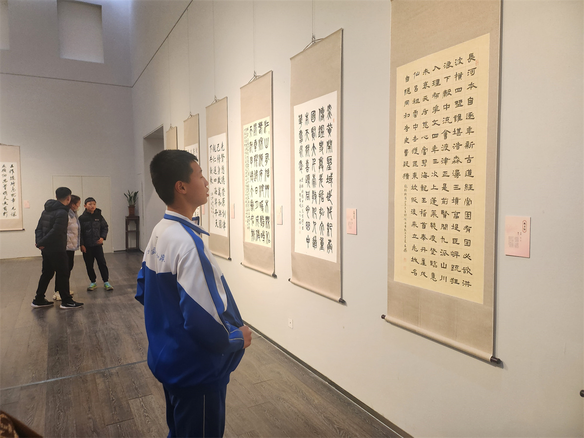 12月27日下午,“师生缘 故乡行——欧阳中石师生诗书作品展”在山东出版美术馆盛大开幕。济南舜耕中学书法社团的师生代表受邀参加开幕式,并参观了本次展览。在墨香氤氲的展厅里,师生们沉浸式感受欧阳中石先生的书学思想与艺术魅力,收获颇丰。