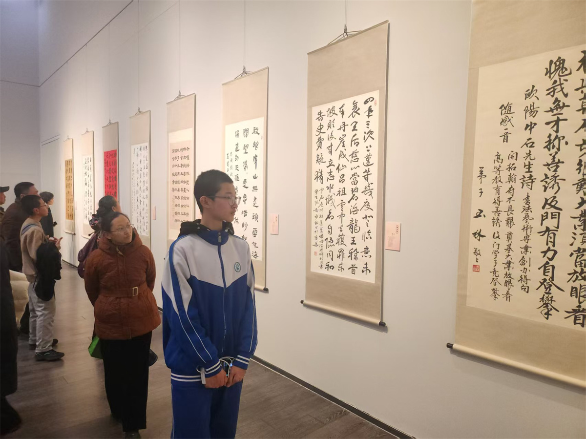 弭思语同学则对展览中师生传承的篇章感触颇深:“看到众多弟子以诗作、书法致敬欧阳先生,我感受到了书法教育中‘薪火相传’的力量。先生为学生‘提供向上攀登的肩膀’,这种师者情怀让我敬佩。作为书法爱好者,我也要以这份传承之心,踏实练习,不负前辈的耕耘。”