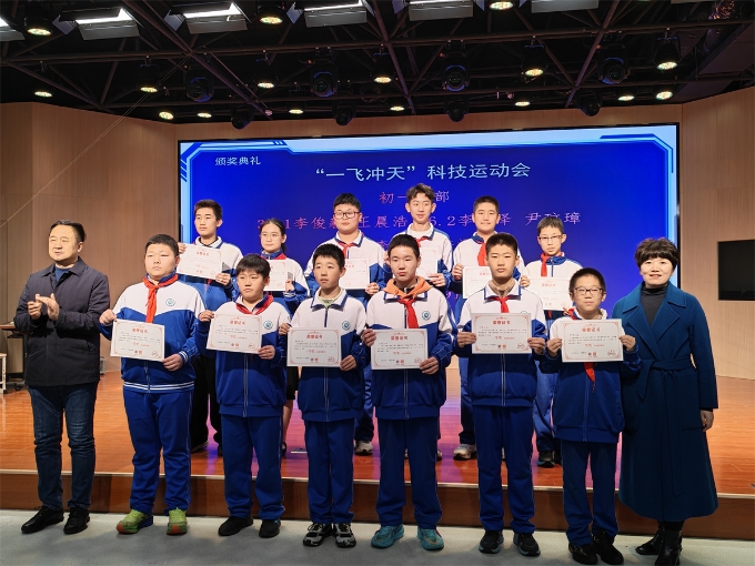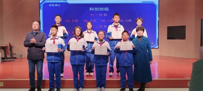在隆重的颁奖典礼上,学校对在本届嘉年华中涌现出的优秀个人与集体进行了表彰。杨国营校长和邱丽娟副校长依次为“银河创想家”绘画比赛、“深空奇想”科幻征文比赛、“蓝天筑梦”航模及“手搓苍穹之眼”制作赛、“一飞冲天”科技运动会的一等奖获得者颁发了“卓越探索奖”。同时,综合各班级在活动中的参与广度与获奖成绩,评选出了初一初二年级共8个“科创班级奖”。