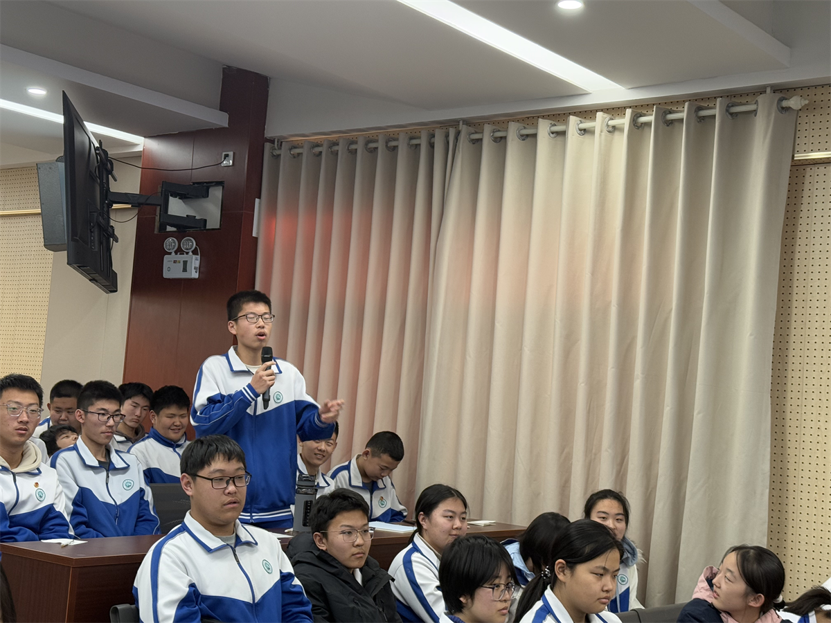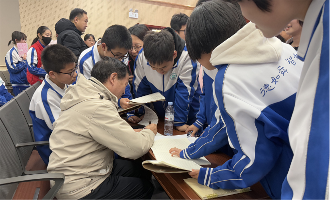 在互动环节,同学们踊跃提问,围绕文学阅读、写作技巧、压力调节等问题与鲁老师深入交流。鲁老师耐心解答每一个问题,用幽默的话语化解学子们的焦虑,传递“坚持所爱,终抵远方”的人生理念,并向同学们提出三个核心理念:一是做自己 24 小时的主人,学会科学规划时间;二是朝着一个目标前进,做到心无旁骛、持之以恒;三是掌握一到两个专属技能,打造属于自己的核心竞争力。