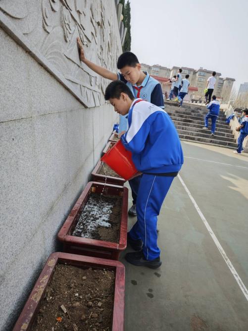 活动现场,同学们热情高涨、分工明确,化身“小小新农人”,在老师的指导下有序开展劳动。有的弯腰翻土,双手紧握铁锹,一点点松动坚硬的泥土,额头渗出细密的汗珠也毫不在意;有的仔细筛选种子,小心翼翼地将饱满的种子播撒进挖好的土坑中,眼神里满是期待;有的负责覆土压实,动作认真细致,生怕惊扰了沉睡的种子;还有的提着水桶,缓缓浇灌,为种子送去春日的滋养。向日葵的种子承载着向阳而生的希望,西红柿、辣椒的种子孕育着酸甜与热烈,香菜、艾草的种子散发着独特的清香,每一颗种子都被同学们寄予了美好的期许,每一个劳作的身影都成为春日里最动人的风景。