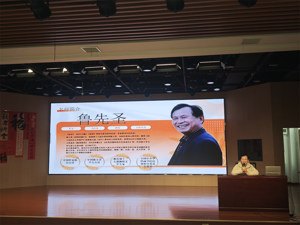 鲁先圣老师是《读者》《青年文摘》等知名期刊的签约作家,更是在文学、书法、绘画等多个领域卓有成就的文化学者。报告会上,鲁老师以“诗和远方”为核心,结合自身丰富的人生阅历与创作经验,从文学创作的初心、成长路上的坚持,到如何在学习与生活中发现美好、追寻理想,为同学们娓娓道来。他用生动的案例、真挚的语言,剖析了“诗”是内心的热爱与追求,“远方”是不懈的探索与目标,鼓励初三学子在学考备考的关键阶段,既要脚踏实地夯实学业,更要心怀憧憬、坚定信念,让精神的丰盈成为前行的不竭动力。