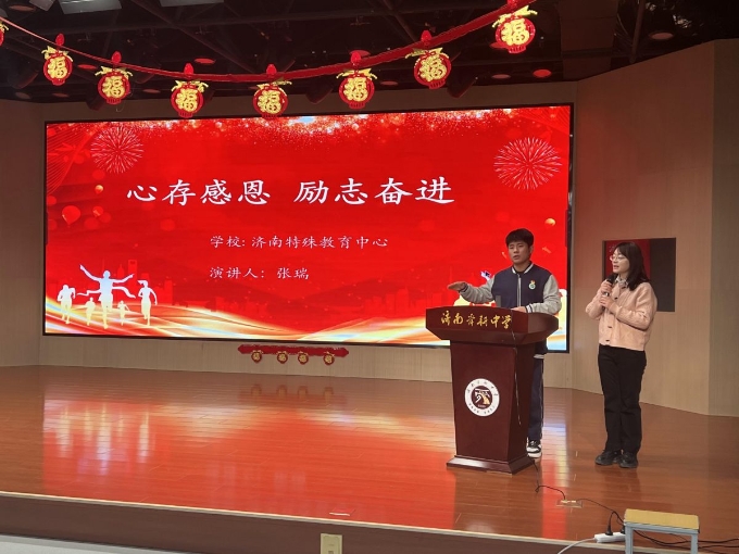 为激发学生内在驱动力,培养学生积极向上、不断进取的意志品质,2024年3月4日,济南舜耕中学初一年级在四楼礼堂开展“名家榜样进校园之特教学子舜耕行活动”。济南特殊教育中心学校领导及部分学生、教师,济南舜耕中学学校领导及34级全体同学、班主任参加了此次活动。活动由年级主任房玉彤主持。