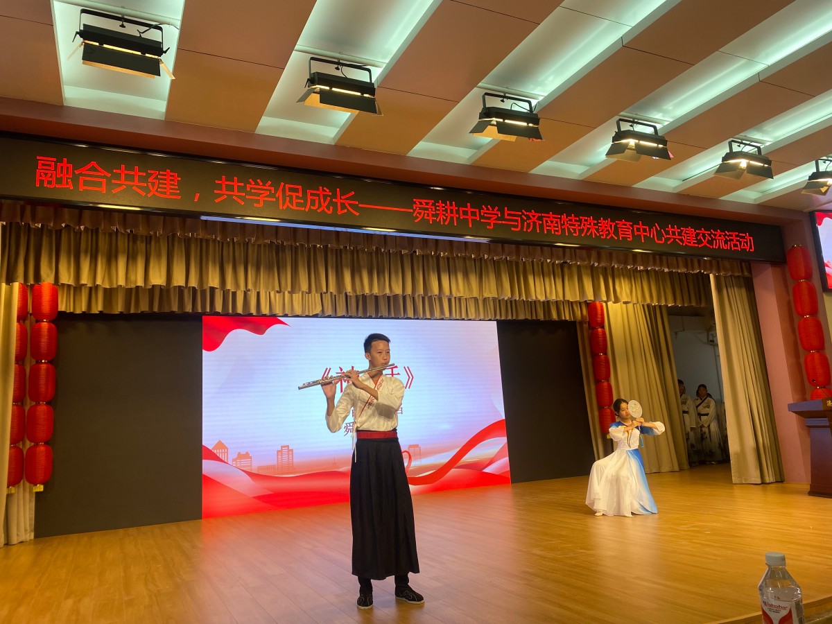 艺术表演环节更是将活动推向了高潮。济南特殊教育中心的视障学生带来了诗朗诵《红色的中国》、合唱《少年中国说》,舜耕中学的学生则呈现了精彩的长笛和舞蹈表演《美丽的神话》。最后,由济南特殊教育中心学生与舜耕中学学生一起表演了手语歌《国家》,展现了新时代学生的艺术才华和积极向上的精神风貌。